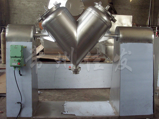 該機(jī)通過(guò)機(jī)械傳動(dòng),使不對(duì)稱的V型圓柱體內(nèi)的物料做往復(fù)翻動(dòng),達(dá)到均勻混合之目的。