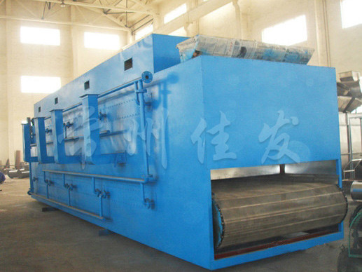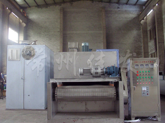 物料由加料器均勻地鋪在網(wǎng)帶上,網(wǎng)帶一般采用12-60目不銹鋼絲網(wǎng),由傳動裝置拖動在干燥機內(nèi)移動。干燥機由若干單元組成,每一單元熱風獨立循環(huán),部分尾氣由專門濕風機排出,廢氣由調(diào)節(jié)閥控制,熱氣由下往上或由上往下穿過鋪滿物料的網(wǎng)帶完成熱量與質(zhì)量傳遞的進程,帶走物料的水份。網(wǎng)帶緩慢移動,運行速度可根據(jù)物料溫度自動調(diào)節(jié),干燥后的成品連續(xù)落入收料器中。上下循環(huán)單元根據(jù)用戶需要可靈活配備,單元數(shù)量亦可根據(jù)需要選取。